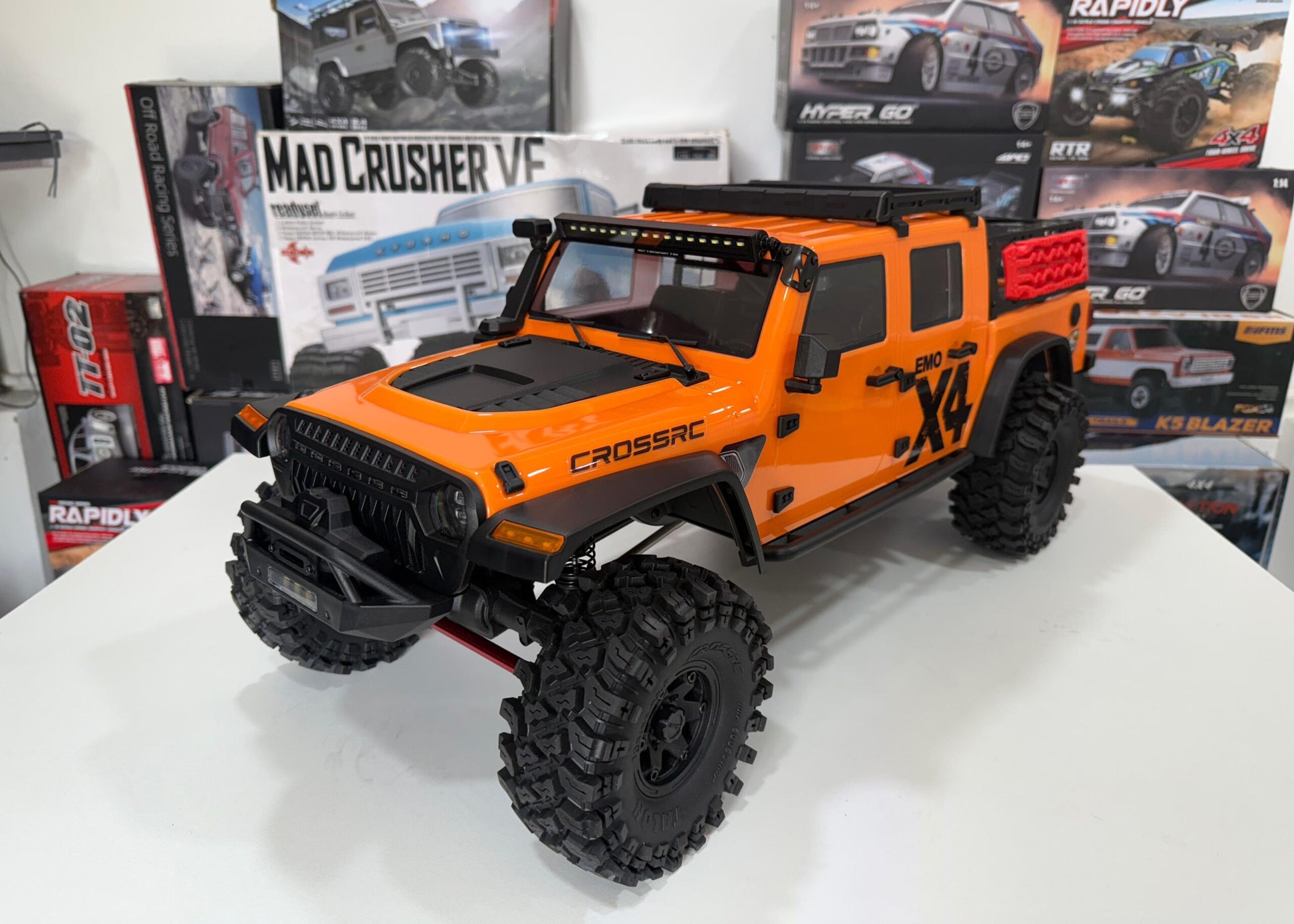 The Cross RC EMO X4 is a 1/8 scale, 4WD RC rock crawler with a 712x301x286mm assembled size and a 436mm wheelbase, featuring a two-speed transmission, remote-locking differentials, portal axles, and a detailed scale body with an interior and LED lights. It is built with a durable metal and plastic construction, uses high-grip TALON MT tires on beadlock wheels, and includes a sound module for realistic engine and horn sounds.